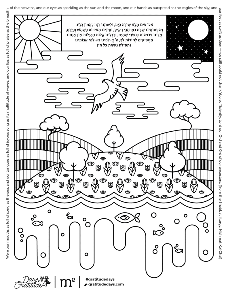 This coloring page is an invitation to take a break from words and physical expressions of thanks. While coloring it in, allow yourself to enter an internal meditative space of recognizing the wonder and awe of the natural world.